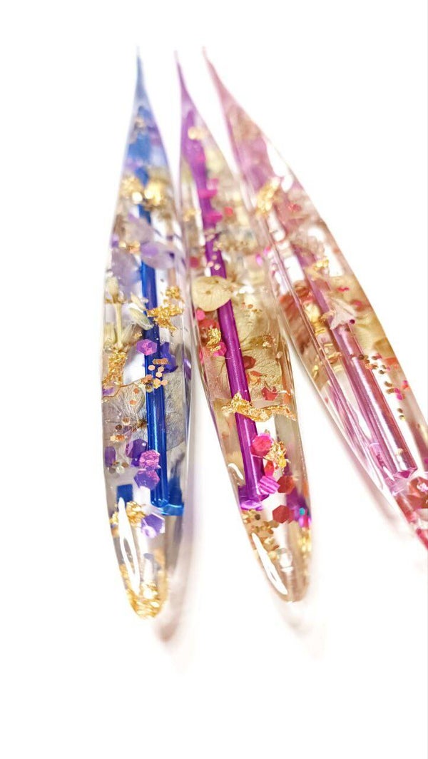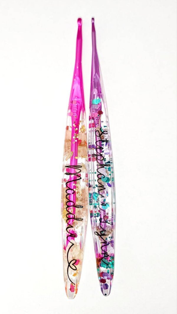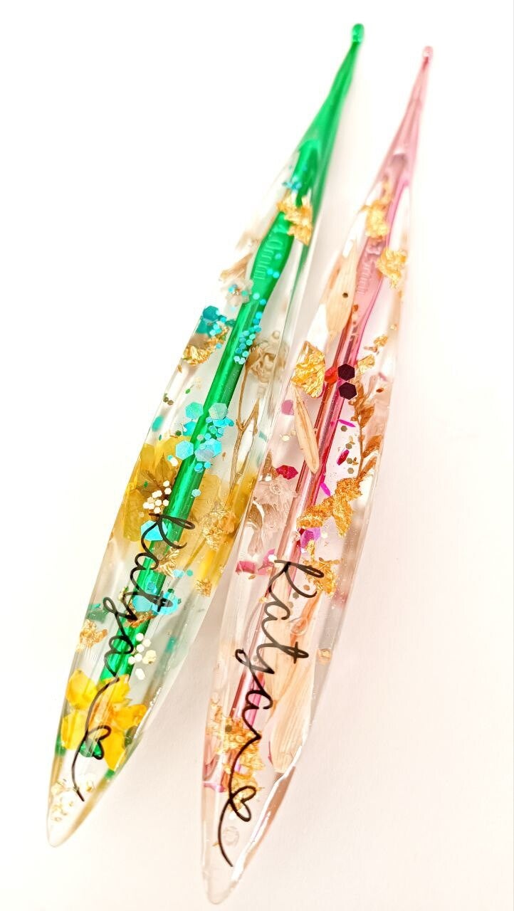 Ik maak de haaknaalden per stuk en uniek met bloemen, bladgoud en glitter.